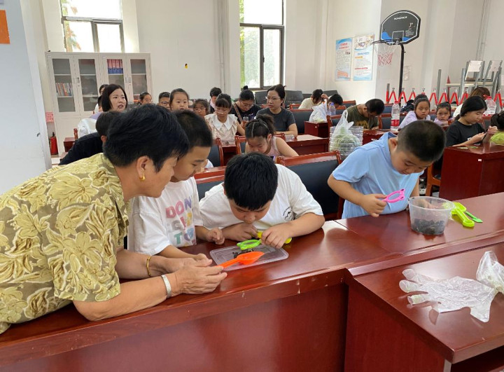 活动开始,天津美城美家科技有限公司的刘老师为孩子们讲解蚯蚓堆肥塔知识,通过实物展示和现场讲解相结合的方式,向孩子们详细介绍蚯蚓堆肥塔的原理、优势以及在垃圾分类和环境保护中的重要作用,让孩子们对蚯蚓堆肥塔有一个全面的认识。在蚯蚓观察区,讲师指导孩子们使用放大镜等工具观察蚯蚓的外形特征、运动方式和生活习性,同时向孩子们讲解蚯蚓营养餐的配方和配置方法,强调营养餐对蚯蚓生长和堆肥效果的重要性。随后,刘老师组织孩子们分组进行蚯蚓营养餐的配置实践,孩子们按照讲师的指导,将菜叶、瓜皮、果皮、腐殖土等配料按一定比例混合,制作出适合蚯蚓食用的营养餐。